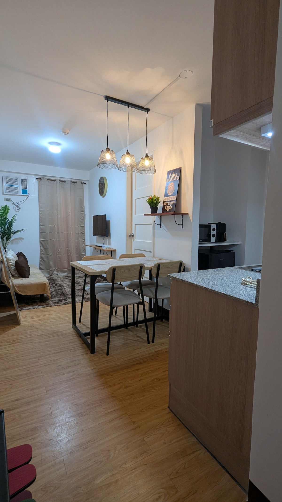 Stort arbeidsbord med kontorstol for digitale nomader/WFH. 100 mbps trådløst nettverk, med sovemasker, mørkleggingsgardiner, te- og kaffestasjon, pluss andre nødvendigheter. 14 minutter til Davao by flyplass, 11 minutter til SM Lanang, og 7 minutter til Samal ferge. Romslig leilighet med ett soverom, estetiske varme lys og design. Queensize-seng, tykk premiummadrass og supermykt sengetøy. Dagligvarebutikk på stedet og døgnåpen vaskeritjeneste. I nærheten av flyplassen, SM Lanang Mall og Samal Wharf. Klar for digitale nomader og kjæledyr.