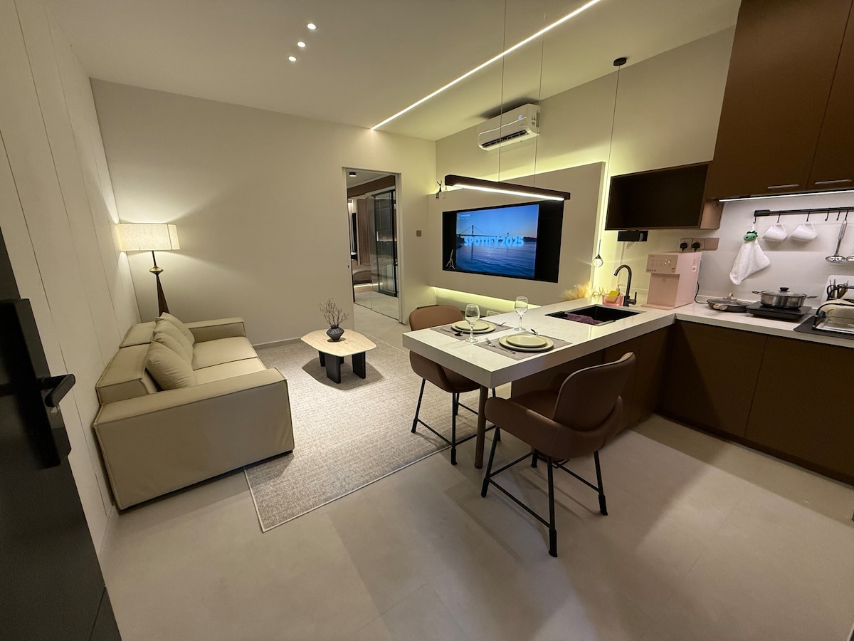 Netizen SOHO ligger i nærheten av MRT BTHO! Perfekt for reisende som søker bekvemmelighet, komfort og enkel tilgang til offentlig transport. Når du går inn på Airbnb, blir du møtt av en varm og innbydende atmosfære. Interiøret er smakfullt dekorert med moderne møbler og beroligende farger, noe som skaper en avslappende atmosfære for oppholdet ditt. Den koselige stuen er utstyrt med en komfortabel sofa, en flatskjerm-TV for underholdning og store vinduer som lar naturlig lys lyse opp stedet.