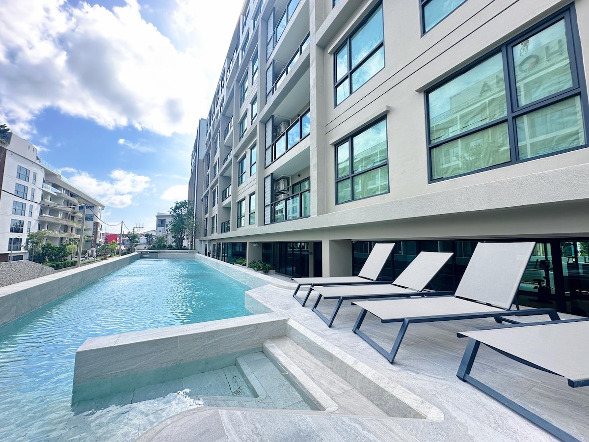 Helt ny, frisk, ren og komfortabel leilighet, som ligger i hjertet av Cherngtalay, Bangtao-stranden. Moderne design, fredelige omgivelser – i nærheten av Laguna, restauranter, Tops supermarked, Porto de Phuket, nærbutikk. Tre minutter til Laguna Phuket med bil. 8 minutter til Bangtao-stranden med bil. Ett minutts gange til Boat Avenue Lakefront. Ett minutts gange til 7-11 nærbutikk. Seks minutters gange til Porto de Phuket.
