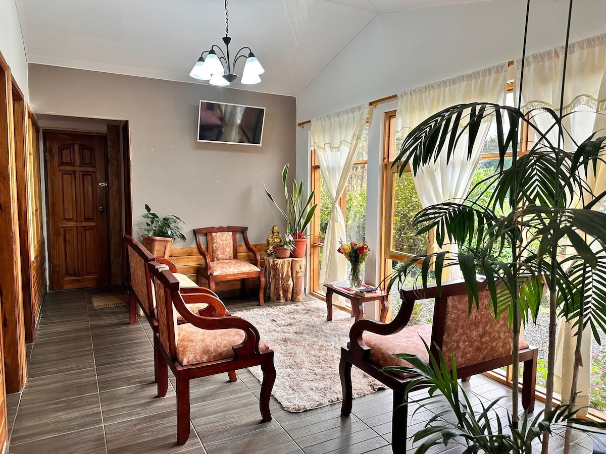 Det er en hytte, som ligger 7 minutter fra sentrum av Baños, full av grønne områder og hager, orkideer og mangfold av fugler, omgitt av fjell og en imponerende utsikt over Pastaza-elven, unik for hvile og familieavslapning. I tillegg må du være oppmerksom på at du må gå opp 38 trinn i sement og rustikk stein, men til slutt vil du bli belønnet med den fantastiske utsikten over Pastaza-elven fra toppen og det nyåpnede tempererte vannbassenget.