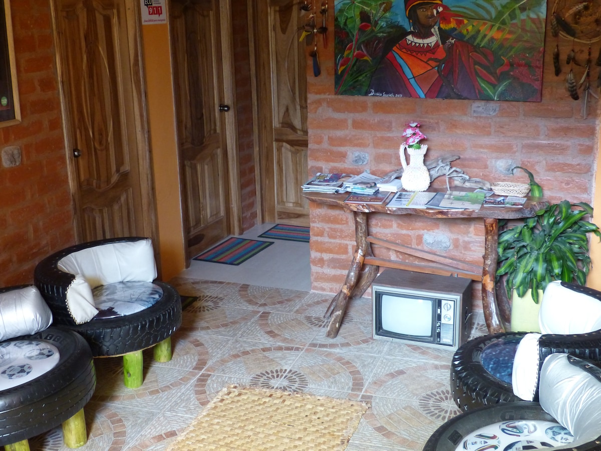 No querrás irte de este maravilloso lugar, hermosa habitación doble privada para tres personas. Rodeada de naturaleza, junto al río Pastaza, a pocos minutos del centro de la ciudad. Amplias áreas comunes y verdes. siente la verdadera conexión con la naturaleza.