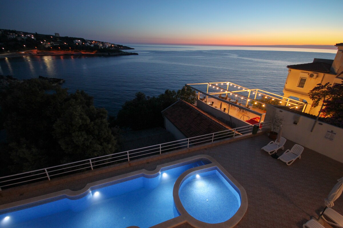 Denne elegante leiligheten i andre etasje strekker seg over 45 kvadratmeter, og blander komfort og stil. Den har et koselig soverom, et bad med badekar, dusj og bidet, og en romslig terrasse med utsikt over Kruče Bay med et stort spisebord - perfekt for å nyte utsikten med et forfriskende glass vin. Det stilige interiøret viser naturstein og parkettfinish og har moderne fasiliteter som flatskjerm-TV, minisafe og minibar.