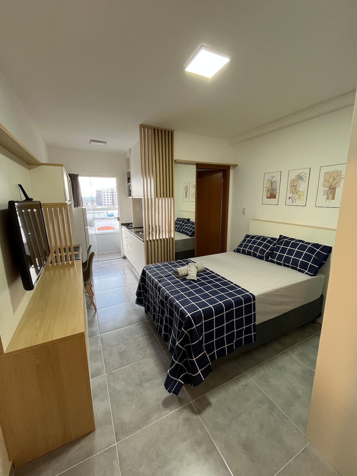 Espaço calmo, aconchegante e completo no coração da nossa cidade. Montado com muito carinho especialmente pensado na funcionalidade e conforto, para você se sentir em casa. Comodidades: •Wi-Fi de qualidade • Cozinha equipada • Áreas comum (lavanderia, piscina, coworking e academia) • Cama de casal e roupa de cama • Banheiro com toalhas e sabonete • Tv 42” • Cafeteira Sem garagem no prédio, tem estacionamento pago próximo e a avenida tem lugares permitidos estacionar.