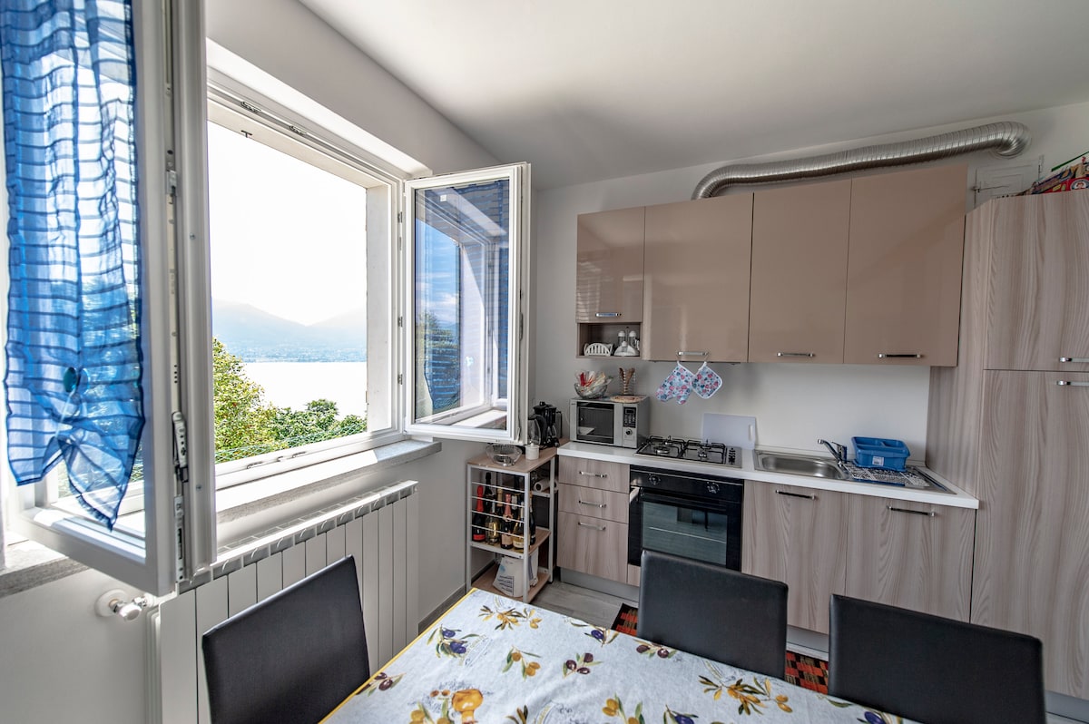 Leilighet med privat inngang og terrasse til eksklusiv bruk. I stuen finner du en sofa, TV og en dør som åpner seg til en lang balkong med fantastisk utsikt over Lago Maggiore. Kjøkken med bord og balkong, med vakker utsikt over innsjøen, to dobbeltsenger og et bad med badekar/dusj. Leiligheten gir direkte tilgang til vaskerommet. En 40 m lang gangvei med trapper skiller huset fra parkeringsplassen