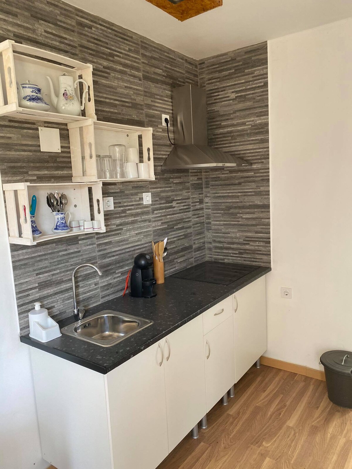 Vi forvandlet en maritim container til et lite hus, og den ligger midt på landet. Huset har et soverom, en stue med kjøkken og et bad. Hele containerhuset er privat og eksklusivt for gjestene. Containerhuset ligger imidlertid på eiendommen til huset vårt, og i dette tilfellet deles hagen og bassenget med oss. Gjestene har også et privat eksteriør med et utendørs bord og grill.