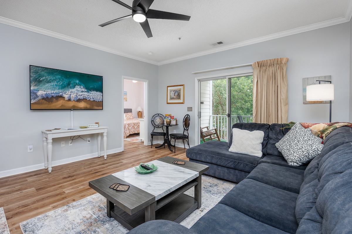 Trenger du en sommerferie i Barefoot Landing? Nyt vår funklende rene, 2BR gjestefavoritt med tilgang til et basseng, en privat balkong og gratis parkering. Bare noen minutter fra stranden, shopping og spisesteder. To soverom og en sovesofa, den har plass til seks personer. Nyt fantastisk utsikt over golfbanen fra din private balkong. Utforsk fire mesterskapsgolfbaner, nyt Barefoot Landings butikker og spisesteder, eller slapp av ved det inngjerdede bassenget. Enheten ligger i andre etasje. Det er ingen heis i denne bygningen.