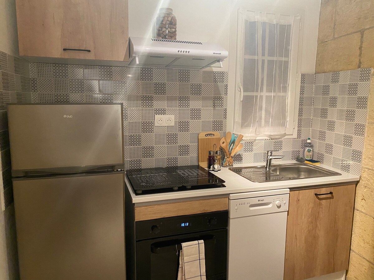 Vi ønsker deg velkommen til vår 20 m² store hytte med aircondition, som har en stor og lys stue med kjøkken, et bad og en terrasse. Den har en egen inngang. Den ligger på et rolig og grønt sted i hjertet av vingårdene i Entre de Mers og halvveis mellom Bordeaux og Saint-Emilion. Denne hytta er perfekt for en student eller en person som kommer for å jobbe i området.