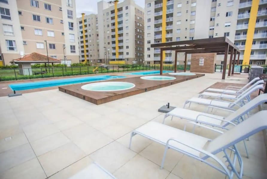 Leilighet i Home Club-kondominium ved sjøen, med svømmebassenger og ulike fritidsmuligheter. Den ligger 15 minutter med bil fra Beto Carrero Park. Du har tilgang til en suite med aircondition og dobbeltseng, ett soverom med dobbeltseng og et annet med tre enkeltsenger, alle med aircondition. Leilighetens kjøkken er godt utstyrt med hvitevarer og redskaper. Balkongen har grillplass og havutsikt. En parkeringsplass og sengetøy og håndklær er inkludert.