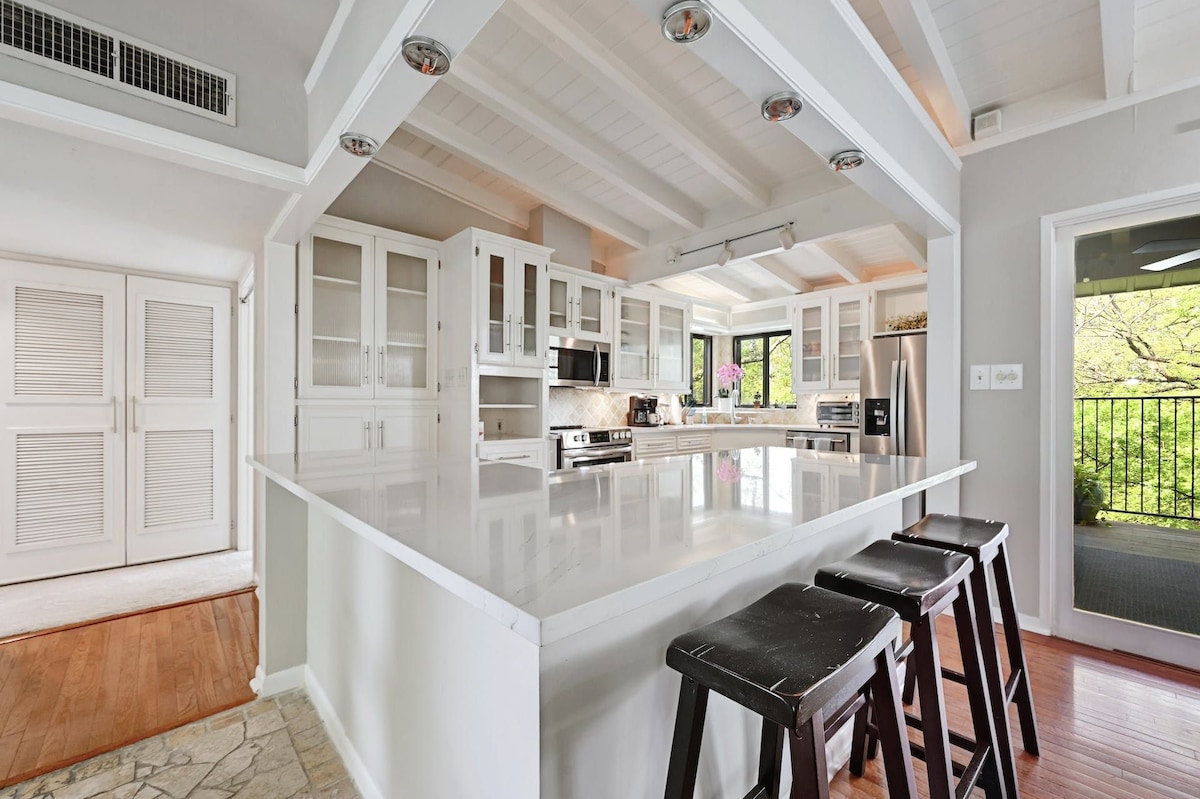 Fem minutters spasertur til Barton Springs-bassenget og ti til Zilker Park. Tre soverom med førstekvalitets madrasser og vakker utsikt: to kingsize-senger med store TV-er + én queensize-seng adskilt fra de andre. To fullt utstyrte bad. Koselig skinnsofa med lenestoler og stikkontakter. Unikt hjem på et unikt sted. Tesla-lader. Ingen fester, takk.
