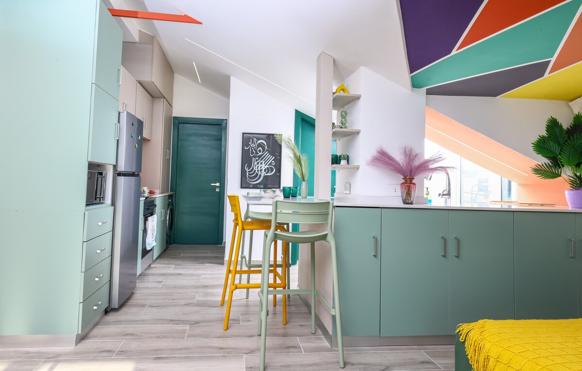 Dette stilige og koselige tilfluktsstedet ligger i hjertet av Batroun Souks, og tilbyr en blanding av moderne design og varm, innbydende innredning. Perfekt for avslapning og inspirasjon, stedet er gjennomtenkt kuratert med levende kunstverk, naturlige toner og elegante møbler, noe som skaper en atmosfære som utstråler komfort og positivitet. Enten du ønsker å utforske Batroun historiske sjarm eller slappe av i fredelige omgivelser, gir denne enheten en rolig utflukt.