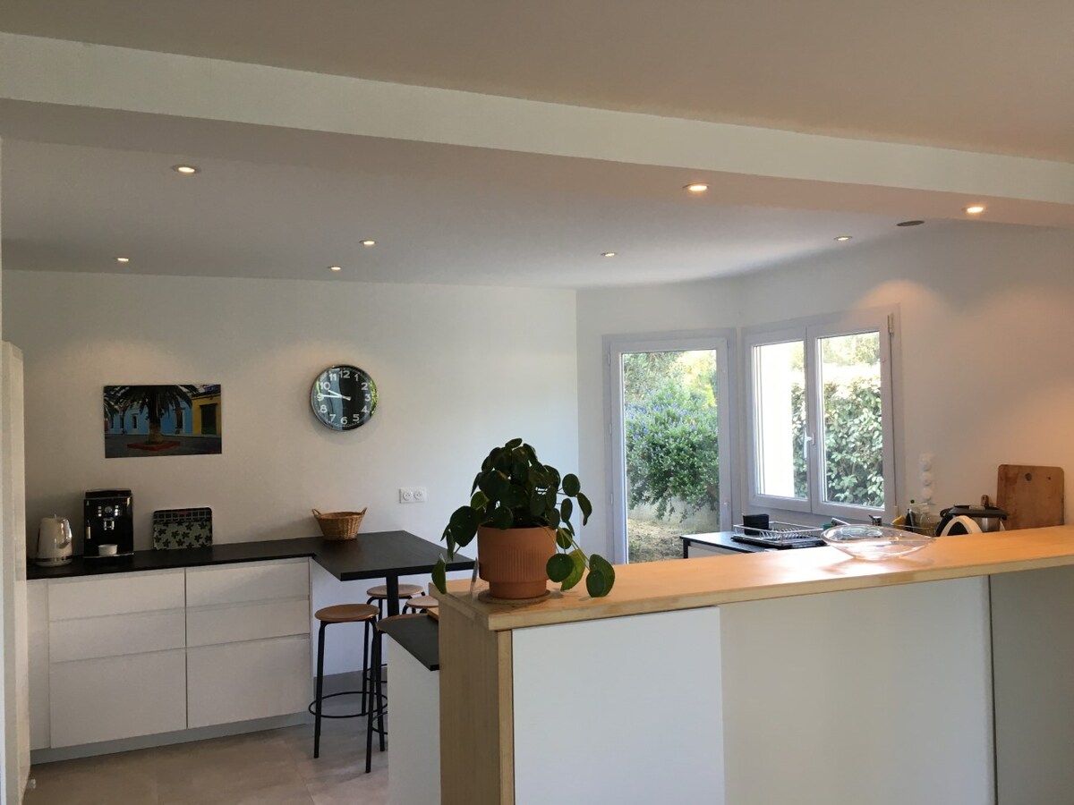 Vi tilbyr en lys villa i ett plan med boblebad (Sdb) og solrik hage. Strendene, den ville kysten, supermarkedet, havnen med butikker og restauranter ligger innenfor 5 til 10 minutters gange. Terasen er utstyrt med solsenger, parasoll, et teakbord. Hagen med frukttrær er helt lukket og uten innsyn. Plaskingen av vannet i dammen med gullfisk bidrar til roen i hagen. Sengene er redt ved ankomst.