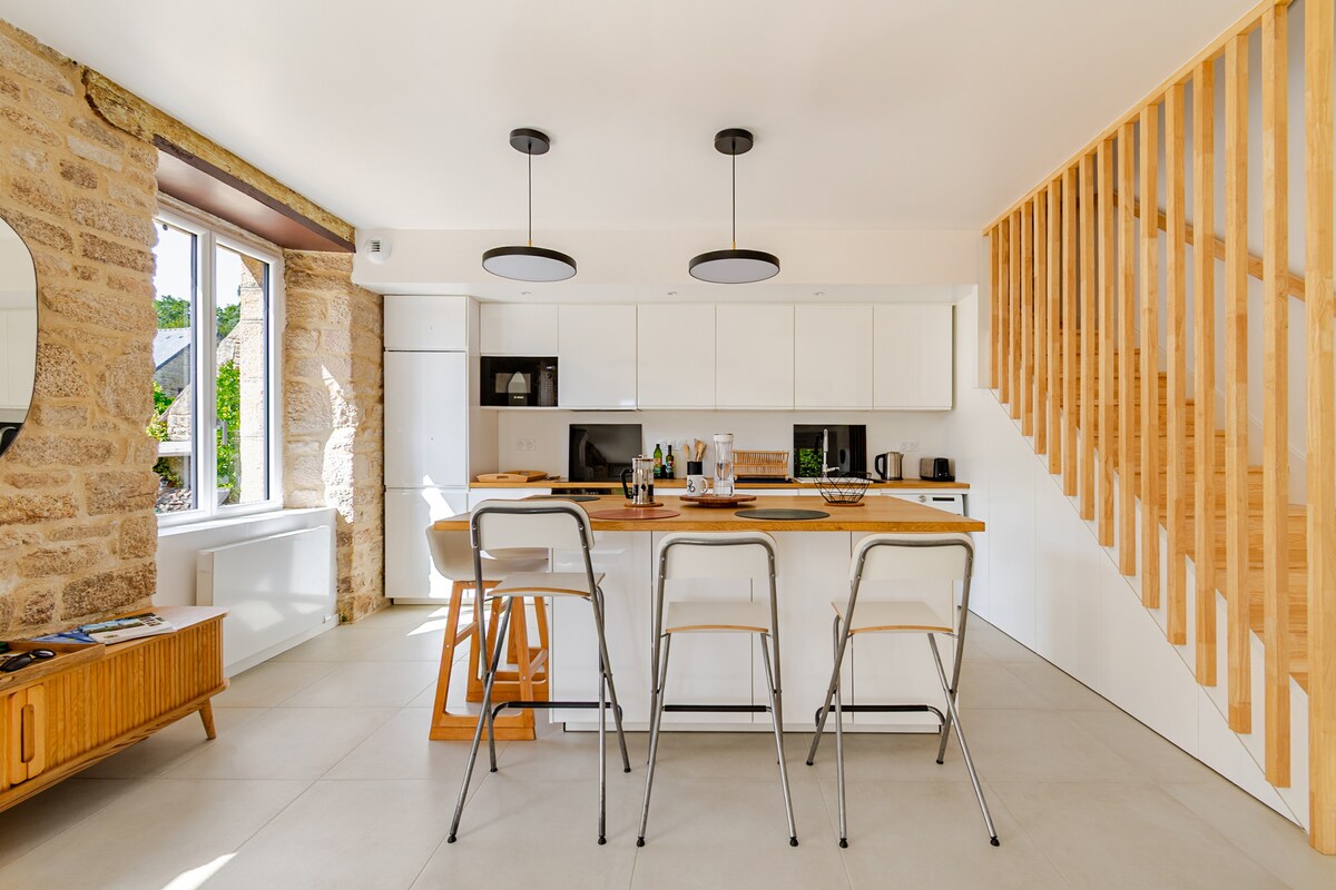 Du vil bo i et renovert gårdshus i et rolig og avslappet miljø. Du finner et fullt utstyrt kjøkken, en romslig og komfortabel stue, og hvert soverom har sitt eget private bad med toalett. Gjestene kan nyte strendene som ligger 30 minutter unna, turstier, symbolske turiststeder i Bretagne (Morbihan-bukten, menrene i Carnac, osv.). Jeg står til din disposisjon for å informere deg om mulige aktiviteter.