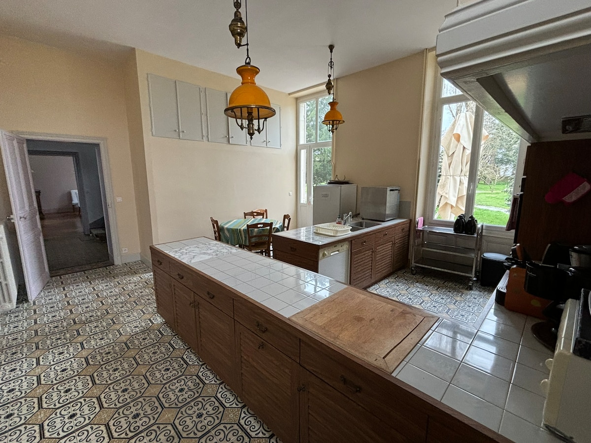 Studioleiligheten, som inkluderer soverom (redde senger), bad (dusj og vask, håndklær), kjøkkenkrok (elektriske plater og mikrobølgeovn) og toalett, ligger i første etasje i et slott (15. og 18. århundre) i blomstrende og trær, rolig, 1 km fra landsbyen via en privat skogssti. Du kan, gjennom annonsen "opphold på slottet", benytte deg av 2 soverom. (se annonsen på Airbnb)