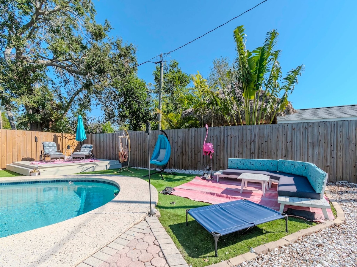Er du på utkikk etter et vakkert basseng hjem i St. Petersburg bare fem minutter fra Floridas beste strender? Dette romslige hjemmet med tre soverom og to bad for åtte gjester har et oppvarmet basseng, pingpongbord, darttavle, putting green og basketballkurv ved bassenget. Nyt raskt trådløst nettverk, flatskjerm-TV og fullt utstyrt kjøkken. Den utendørs skjermede terrassen har en komfortabel seksjons- og smart-TV, mens bassengområdet har lenestoler og møbler. Bare to miles til stranden – perfekt for avkobling.