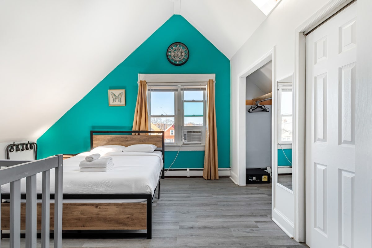 Velkommen til familier med barn i alle aldre, med én privat parkeringsplass i oppkjørselen. Ideell, trygg beliggenhet med tre soverom, ett bad og ekstra lekerom for barn. Stue, spisestue og fullt utstyrt kjøkken. Nyt privatlivet i denne duplex 2/3 leiligheten i et privat hus. Trygg gangavstand til NYC-transport, restauranter, barer og 15 minutter til EWR flyplass. Direktebuss til NYC ligger ved hjørnet, fem minutters gange til 34th St light rail station. Som vert er vi noen skritt unna i første etasje.
