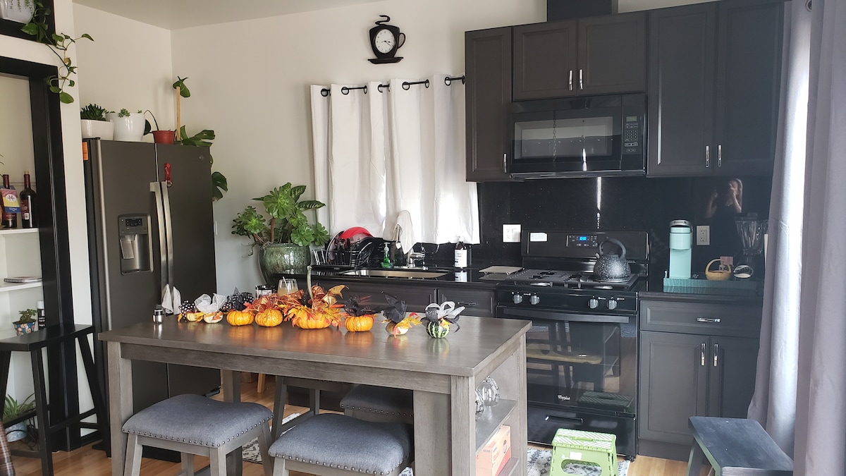 Kom og nyt denne 1-sengs enheten. Et koselig og lyst soverom med en komfortabel queensize-seng. Stuen består av en egen spiseplass og et avslappende område med sofa og TV. Kjøkkenkroken har mikrobølgeovn, en liten stekeovn og en k-kopp kaffetrakter, men ingen KOMFYR. Nyinstallert oppvarming og kjøling klimaanlegg. Denne suiten er en del av et enkelt familiehus. Resten av huset leies også ut som en Airbnb-enhet, men med egen inngang. Dekkområdet deles. Inngangen er i bakgården.
