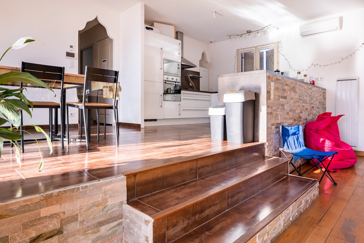 Slapp av i denne rolige og elegante boligen. . Leilighet i første etasje, med egen inngang i et kondominium med bare 2 leiligheter. Beliggende i sentrum av Villefranche-de-Lauragais. . Denne koselige og elegante leiligheten i Japandi-stil, vil gi deg en behagelig kveld eller helg. . Den består av et kjøkken, en spisestue, stue med kontor og en koselig soveplass med bad og stor dusj.