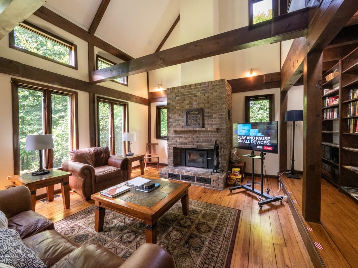 Denne arkitektoniske perlen med glassvinduer som går rundt hele huset ønsker gjestene velkommen med sitt unikt designede, uformelle interiør på 7 private skogområder. Kos deg rundt den vedfyrte peisen med vinduer fra gulv til tak som bakteppe, eller sitt på den ekspansive terrassen rundt bålplassen og se på stjernene. Bruk det som en hjemmebase for de fantastiske kulturelle og utendørsaktivitetene i området, eller nyt naturen i luksus uten å forlate hjemmet. *Bestill midt i uken for rabatterte priser IG@midcenturyoctagon