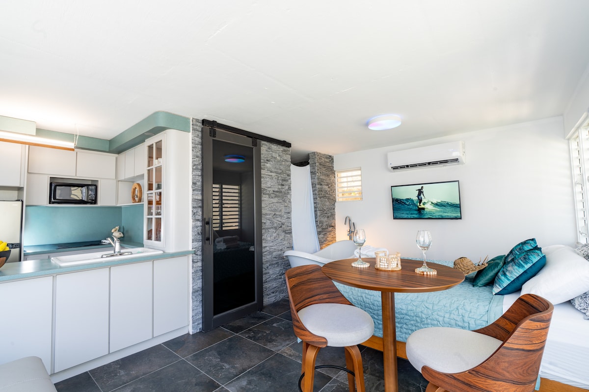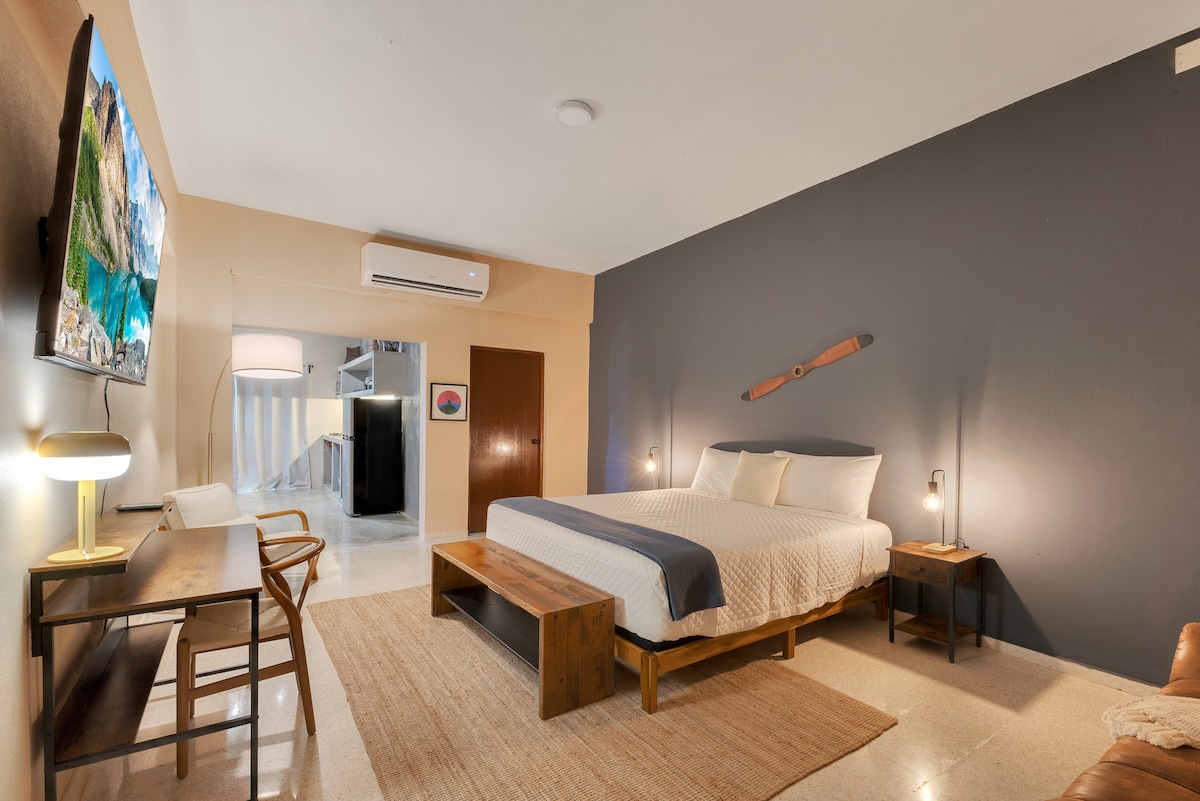 Velkommen til det fredelige feriestedet ditt med ett soverom i Aguadilla i Puerto Rico! Denne gjennomtenkte leiligheten er designet med tanke på komfort og stil, og har en koselig seng, eget bad og et fullt utstyrt kjøkken. Nyt en dedikert arbeidsstasjon, raskt trådløst nettverk og en flatskjerm-TV. Minutter fra over ti spektakulære strender og i hjertet av Aguadillas gastronomiske sentrum, er det den perfekte blandingen av avslapning og bekvemmelighet for både jobb og fritid.