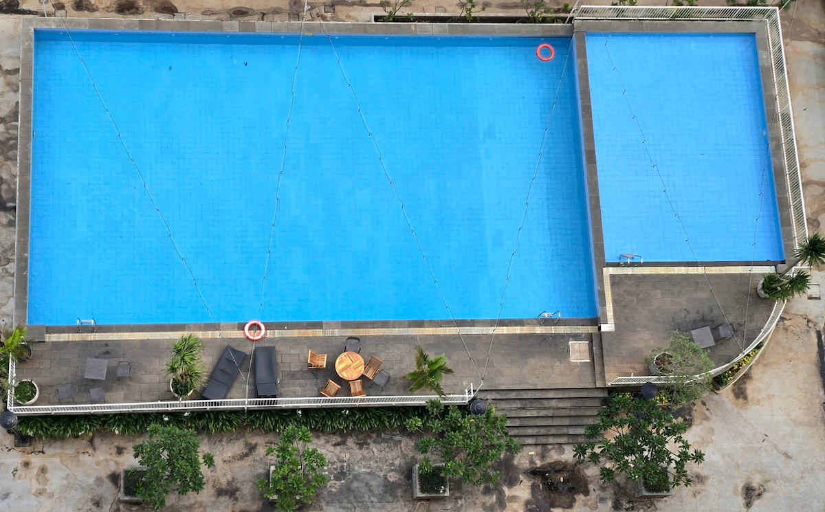 Trådløst nettverk med høy hastighet. Netflix. Rabatt for langvarige opphold! 🚭 Den eneste unike hjørnesuiten med to soverom og industriell, elegant design. Enten du blir for forretninger eller en helgeferie, vil vi sørge for at du har et komfortabelt opphold. Denne selvbetjente RØYKFRIE enheten ligger i 32. etasje, og har fantastisk utsikt over Bekasi-landskapet, MBZ-veien og LRT + høyhastighetstog. Den har 2200 watt elektrisitet, for 2 AC, kjøleskap og komplett kjøkkenutstyr for 4 personer. Lagoon Mall ligger rett nedenfor leiligheten. Parkering er IKKE gratis.