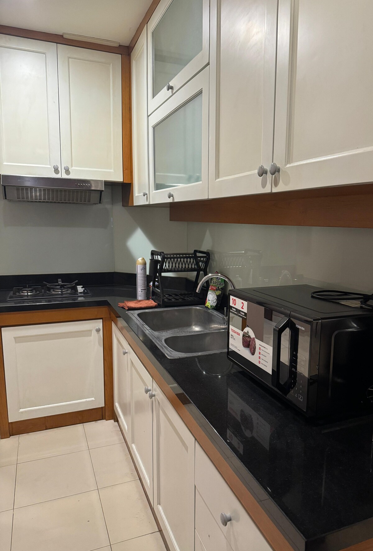 En elegant studioleilighet på 24 kvm i Jakartas sentrum, som blander stil og bekvemmelighet. Inkluderer kjøkken, raskt trådløst nettverk, luftrensing, 43 tommers smart-TV, lydanlegg og Netflix. Det er ideelt for ulike typer opphold, med kontaktløs tilgang og fasiliteter som basseng, boblebad, treningssenter og basketball. Nå med omvendt osmose-dispenser og matavfallshåndtering. Bildet viser en gasskomfyr som er erstattet av en induksjonskomfyr (for å følge leilighetens retningslinjer for brannfarer).