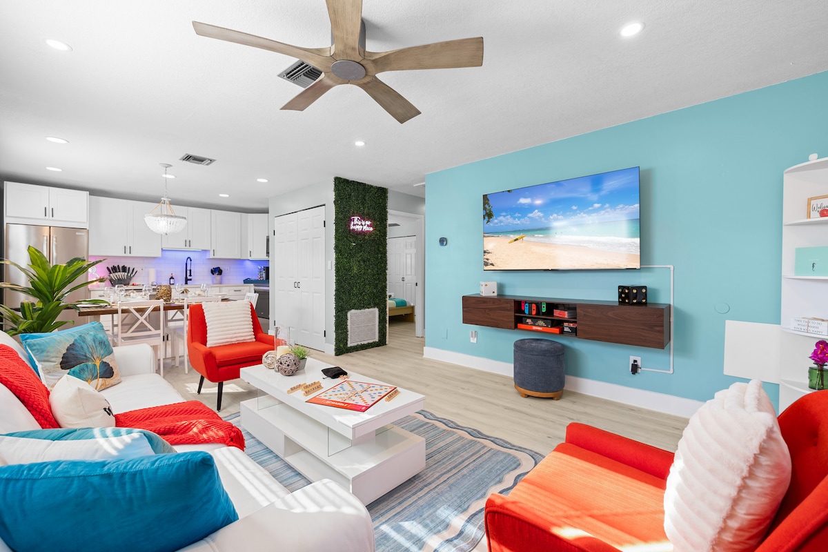 Velkommen til Coastal Palms, din ultimate strandferie i nærheten av IRB! Dette stilige mid-century moderne hjemmet ligger bare noen minutter fra Golfens vakreste kyster, og kombinerer kystsjarm med moderne bekvemmeligheter. Designet for både avslapning og moro, du kommer til å elske boblebadet, bakgårdsoasen og spillloungen med et bordtennisbord. Denne ferien inkluderer alt du trenger for en bekymringsfri FL-ferie! Enten du planlegger stranddager, grillkvelder eller filmmaraton på storskjerm, starter drømmeferien din her. 🏓