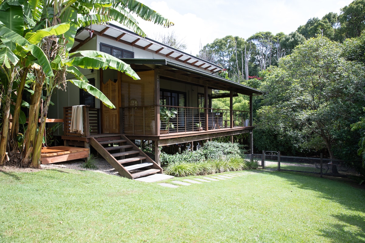Tree House er et avslappende hjem borte fra hjemmet med alt du trenger for en helg, uke eller lengre opphold. Vi har reversert syklus aircondition og trådløst nettverk. Bare noen meter fra det rolige, varme vannet i Byron Bay og en 800 meter lang spasertur langs stranden fra sentrum. Det er et minimumsopphold på to netter. Tree House er et frittstående hus omgitt av frodige tropiske hager. Et separat soverom med queen size-seng og en seng i første etasje som kan konverteres til to store komfortable enkeltsenger.