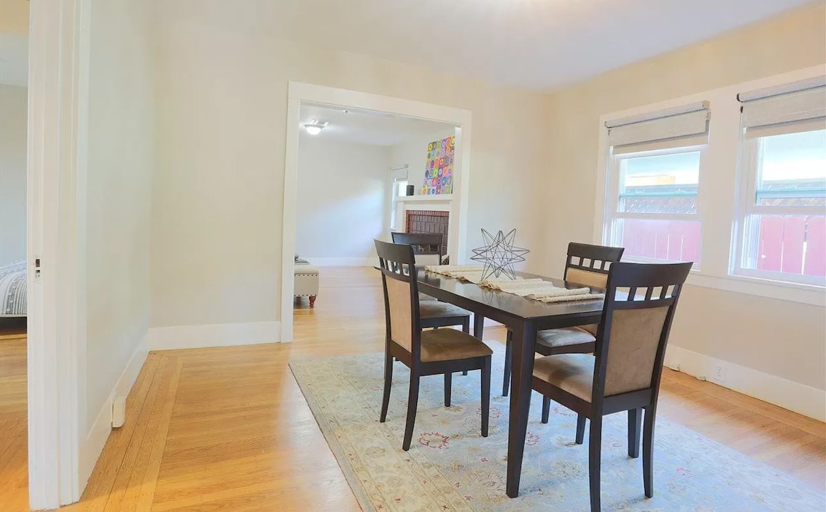 Velkommen til vårt hjem i tradisjonell stil i 1906 i Poet 's hjørne; inkluderer et gourmetkjøkken, terrasse, hage, spisestue, stue med en full trelommedør som lukker hele rommet m/ en queen sovesofa, et privat king rom + eget bad, og gjesterom m/ queen & single. Komfortabelt med syv sengeplasser. I nærheten av BART, butikker i 4th street-distriktet, busslinjer, restauranter og kafeer, alle til fots. Hjemmet ligger bak to hjem utenfor gaten, og gir en rolig oase fra bylivet.
