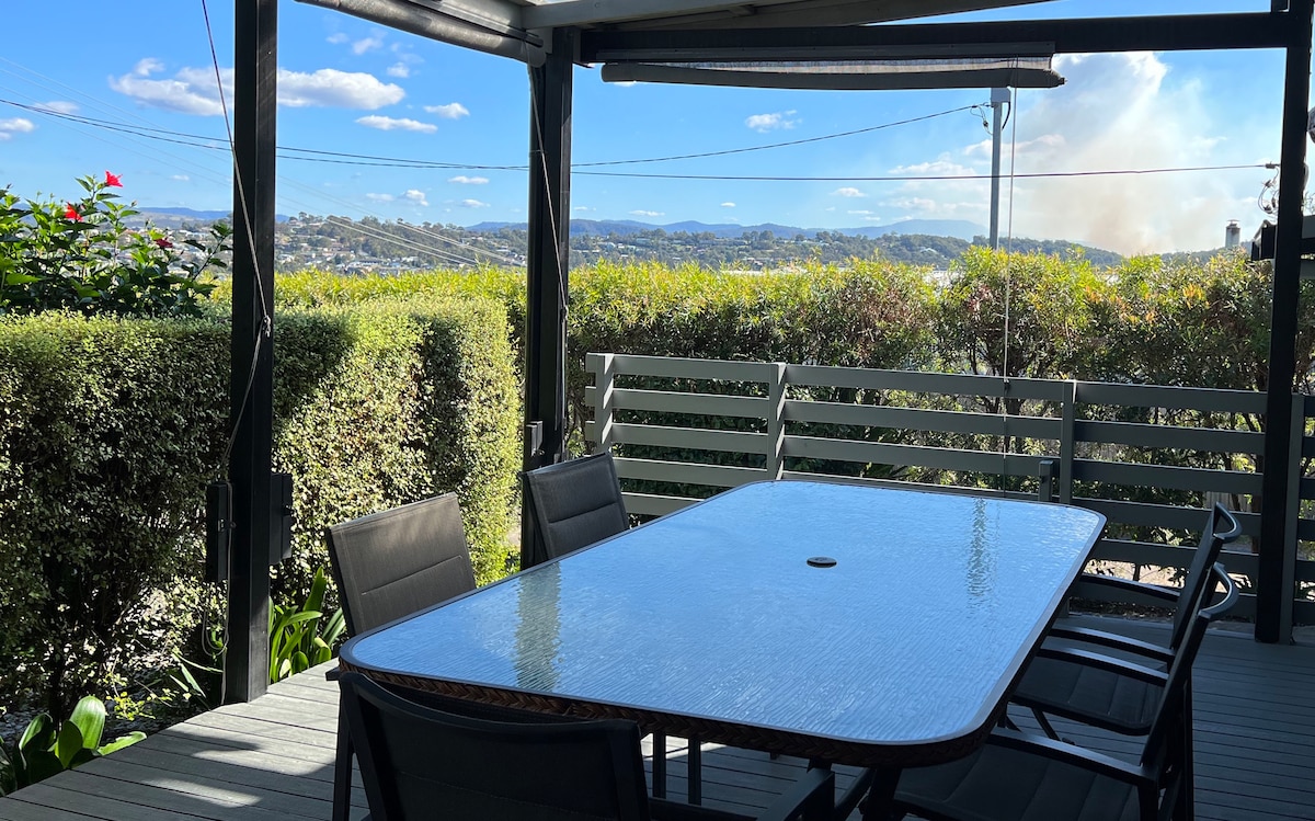 Du kommer til å elske Crows Nest så snart du ankommer! Ligger høyt oppe på bakken med utsikt over Merimbula Bay, innsjøen og byen. Utsikten er fantastisk! Du har eksklusiv bruk av det nedre nivået i huset mitt med egen inngang. Det tilbyr en stor stue med åpen planløsning, kjøkkenkrok, separat soverom med kingsize-seng og et bad. Leiligheten har fullt klimaanlegg. Se de magiske solnedgangene fra den ekspansive undercover-dekket mens du nipper til favorittdrinken din.