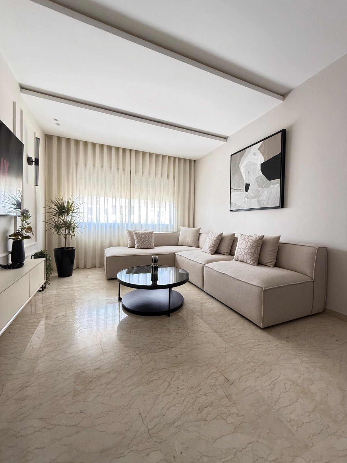 Velkommen hjem, nydelig og praktisk leilighet på Bliving, ideelt for et kort opphold for å oppdage Casablanca gamle Medina historiske by, Marina, kjøpesentre, la corniche og flere turistattraksjoner i nærheten på få minutters gangavstand. Bygningen ligger på hotelltrekanten, og er omgitt av luksushoteller som Sofitel, Novotel, % {smartot, Royal Mansour og Ibis. Direkte forbindelse til flyplassen med tog, og til de andre marokkanske byene med Casaport togstasjon foran hjemmet.