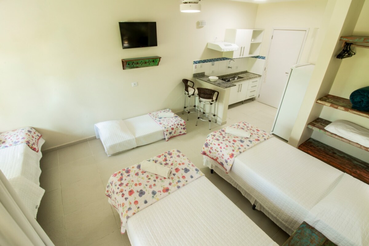 A suite possui uma cama de casal Queen Size (ou duas camas de solteiro), uma TV a cabo de 32'', ar condicionado, frigobar e banheiro privativo.