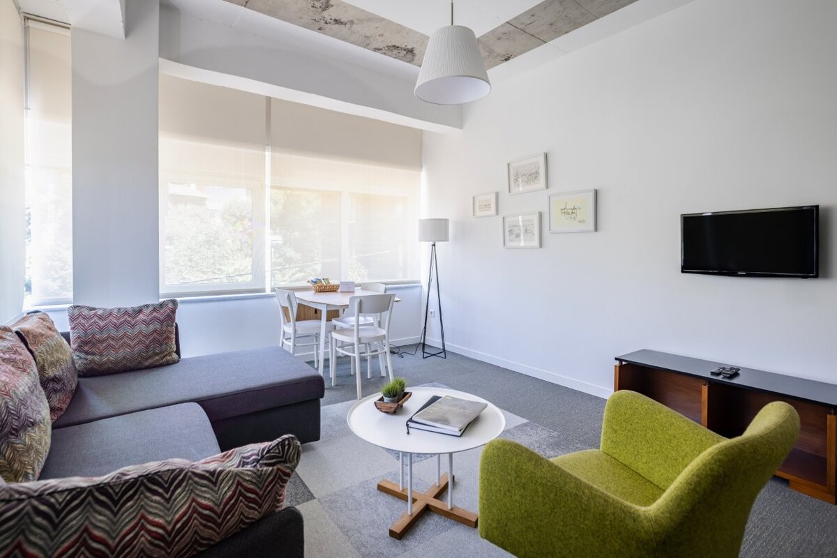 Suiten vår, som ligger i første og andre etasje i bygningen vår, tilbyr en komfortabel opplevelse med et elegant design. Rommet har en TV med Netflix-tilgang, et kjøkken og en elegant separasjon mellom sengen og stuen. Den svingbare TV-en kan ses komfortabelt fra alle vinkler. Bygningen vår ligger sentralt til, nær T-banestasjonen og i gangavstand til transport. Det er et lite vindu på rommet for ventilasjon.