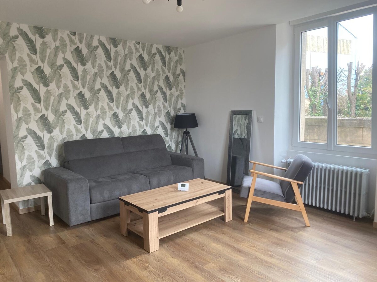 LA DEG FORFØRE! I nærheten av sentrum, rolig og diskret boligområde med gratis parkering. Vakkert hus med en stor stue i første etasje med et fullt utstyrt kjøkken (ovn, mikrobølgeovn, kokeplate, kjøkkenvifte, kjøleskap, Senseo kaffemaskin, vannkoker) som åpner seg til en vakker stue, et vaskerom, et bad med dusj og et separat toalett. I andre etasje, to flotte soverom med garderobe. WI-FI (fiber) og TV med registrert Netflix.