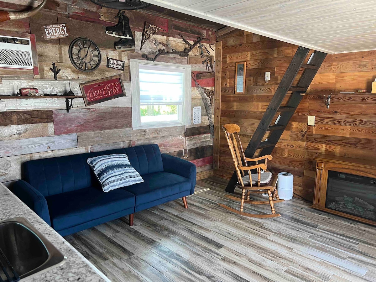 Denne ultimate studiohytta er ideell for to. Queen-sengen i tømmer er hovedfokuset, men TV-en og peisveggen i trepaller gir også et morsomt design. Vasken og kjøkkenøya fungerer som spiseplass med to barkrakker ved kjøkkenkroken, som inkluderer mikrobølgeovn, minikjøleskap og kaffekanne. Bordsettingene er mikrobølgeovnssikre og klare til bruk. Badet har en dusj. Du kommer til å elske den private terrassen med lite bord og stoler og din egen grill. Solnedganger inkludert!