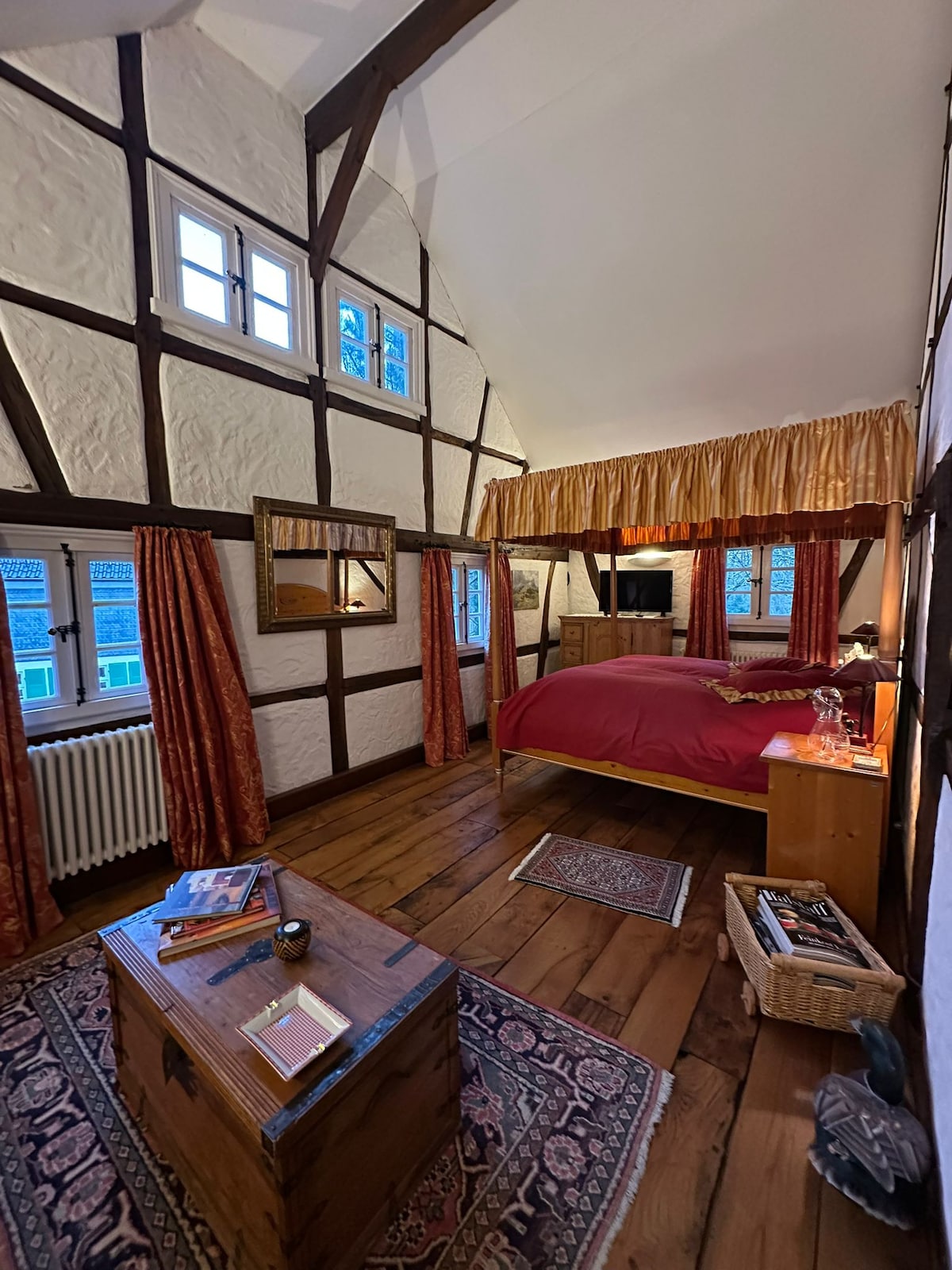 Den koselige leiligheten i den sjarmerende gamlebyen i Lennep ligger i hjertet av byen, på torget. Innredningen er ekstravagant for den som elsker det spesielle. Buss og tog, samt alt du trenger for daglige behov, er innen gangavstand. En parkeringsplass i parkeringshuset i gamlebyen kan bestilles på forespørsel. Jeg er tilgjengelig for alle spørsmål og ønsker, og jeg vil gjerne organisere det jeg kan for deg. Vennligst spør om kjæledyr.