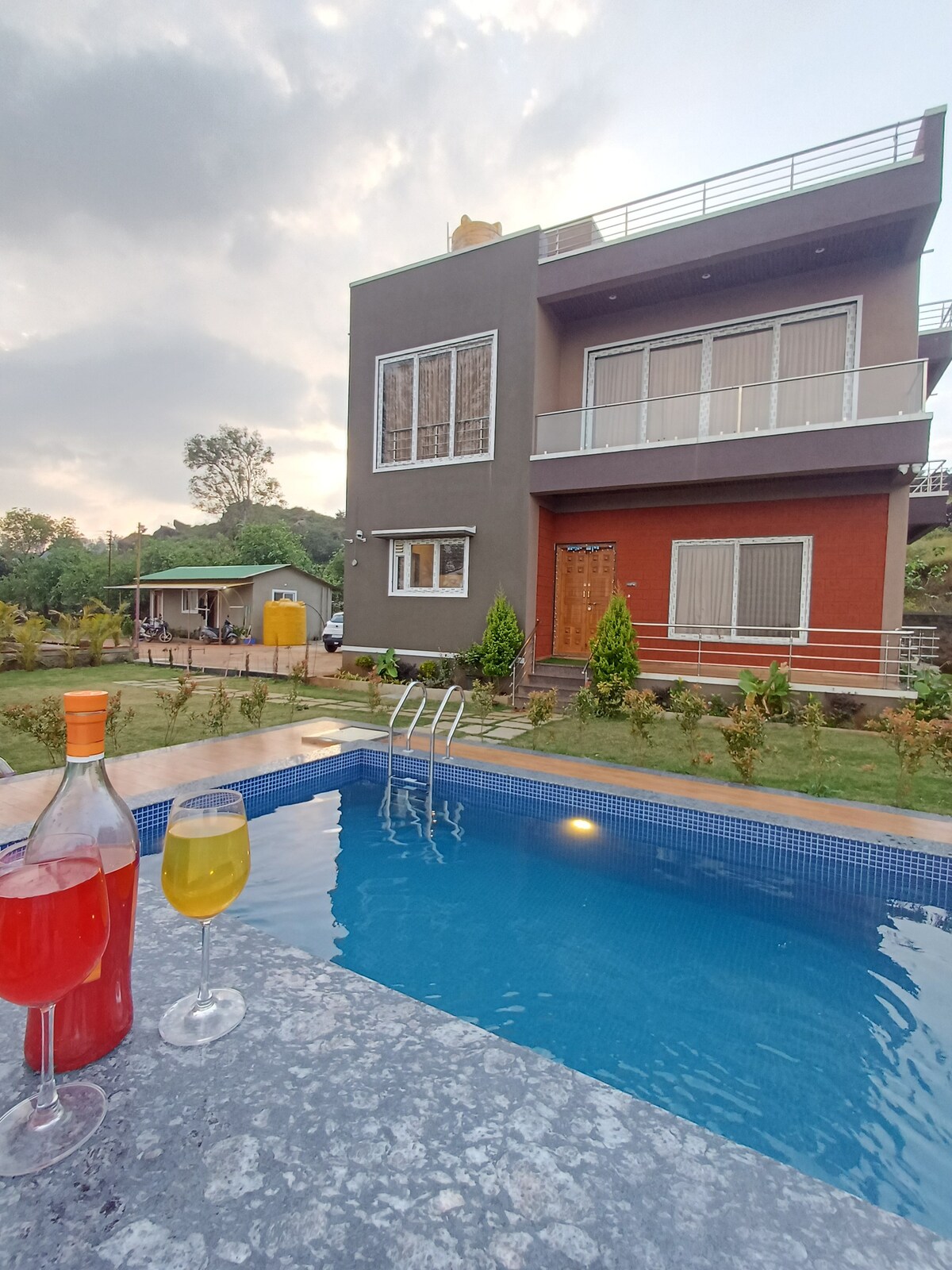 Luksusvilla på 6BHK med fjellutsikt, frisk luft og et privat basseng — perfekt for familieferier eller vertskap for arrangementer. Har romslige lounger, elegante soverom med balkonger, komplett kjøkken, smart-TV, trådløst nettverk og daglig rengjøring. Nyt uteservering, frodige hager og rolige omgivelser. Ideell for feiringer eller fredelige ferier, bare noen minutter fra naturskjønne stier og lokale attraksjoner. En perfekt blanding av natur, komfort og stil.