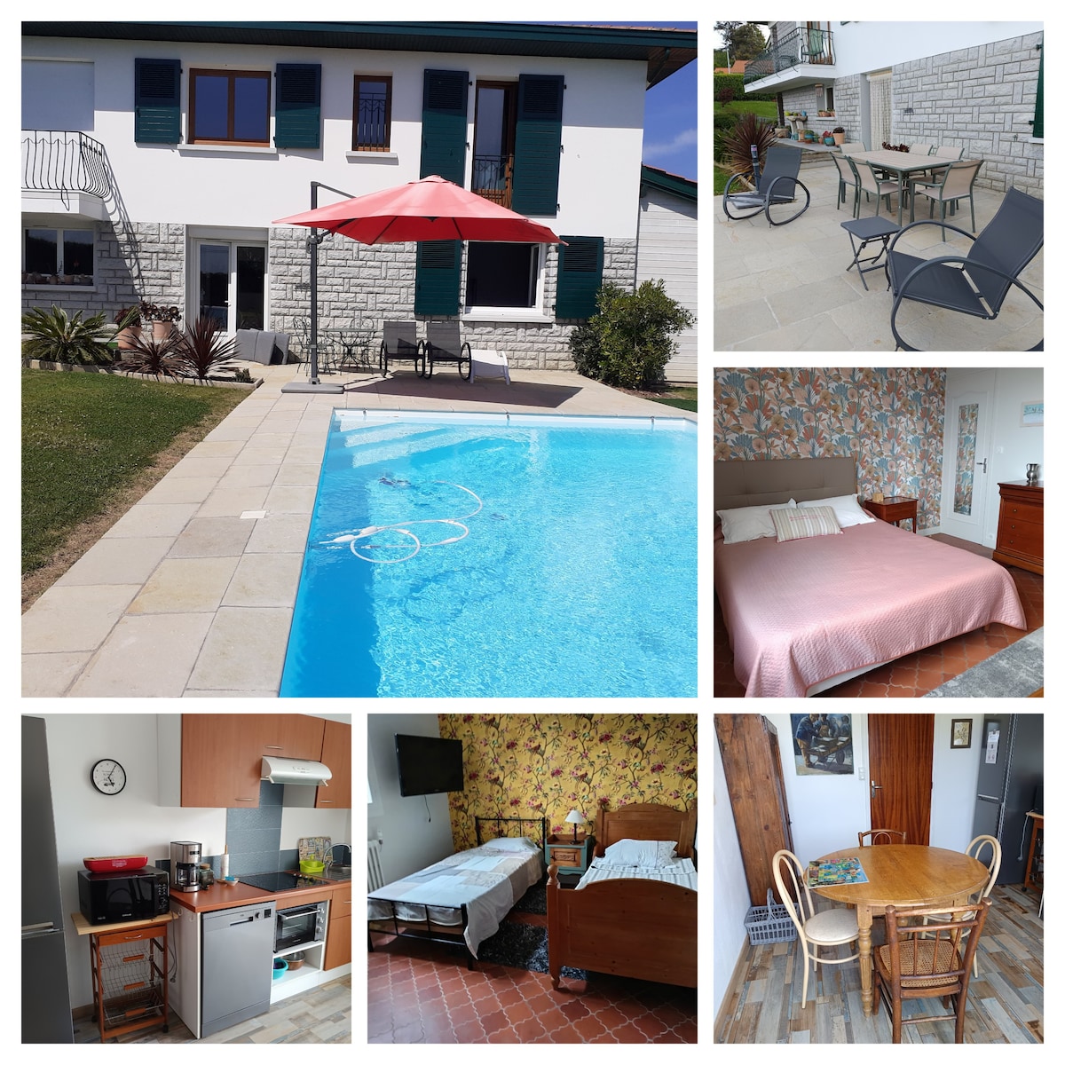 Hei, Jeg ønsker deg velkommen til leiligheten min for et rolig opphold i Anglet med en åpen utsikt over fjellene og skogen. Jeg leier ut 2 soverom som deler et bad med dusj med jetstråler og et separat toalett. Det ene er utstyrt med en seng på 140 cm og det andre med 2 senger på 90 cm som kan settes sammen til en på 180 cm. Begge har tilgang til: sengetøy, håndkle, servise, vannkoker, Senseo-maskin, kjøleskap, mikrobølgeovn, wifi. Mulig tilgang til parken, og til sykkelskuret i boligen.