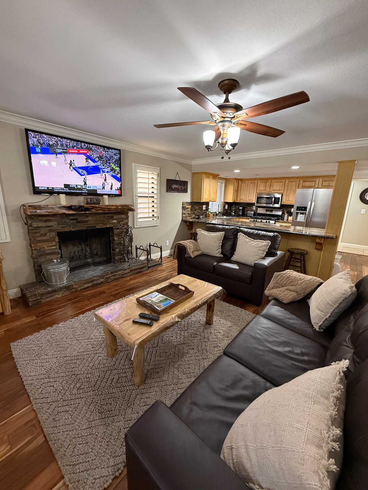 Sollyset fyller denne nydelige hytteenheten i andre etasje, og setter stemningen for en dag på fjellet. Med høye hvelvete tak føles det åpent, samtidig som det føles koselig. Best av alt, bare noen minutters spasertur til stolheisen på Snow Summit. Tenn opp grillen og slapp av med venner og familie etter en dag i bakken eller utforsk landsbyen. Et fullt kjøkken for alle matlagingsbehov og en smart-TV for filmkveld. Finn deg til rette blant den komfortable innredningen, du er på hytta nå.