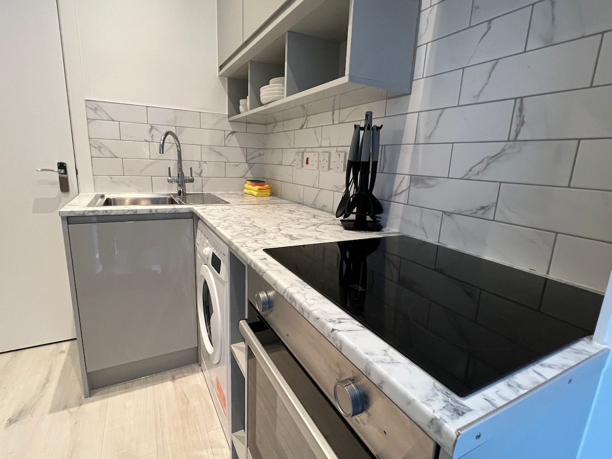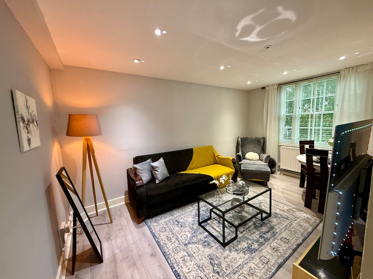 Velkommen til den stilige byutflukten din! Denne moderne leiligheten med ett soverom, med to sofaer som blir til senger, er ideell for små grupper eller familier. Nyt et fullt utstyrt kjøkken med kaffemaskin, vaskemaskin og tørketrommel, alt du trenger for et problemfritt opphold. Slapp av på et lyst, komfortabelt sted med rent sengetøy, gratis toalettartikler og et kjøleskap med forfriskende drinker. En perfekt blanding av komfort og bekvemmelighet i hjertet av London. Vi gleder oss til å være vertskap for deg!