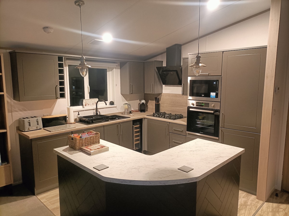 Cosy countryside lodge with wood-fired hot tub & bubbles. Sleeps 4,Optional private sauna hire available for a relaxing rural escape. There is Gas central heating which is on for three hours in the evening and 2 hours in the morning during the months of September 31st to March 31st. If heating is required afforestation that period there is an off grid charge of £20.00 A warm, peaceful lodge retreat perfect for romantic breaks, celebrations, walking holidays and seasonal getaways.