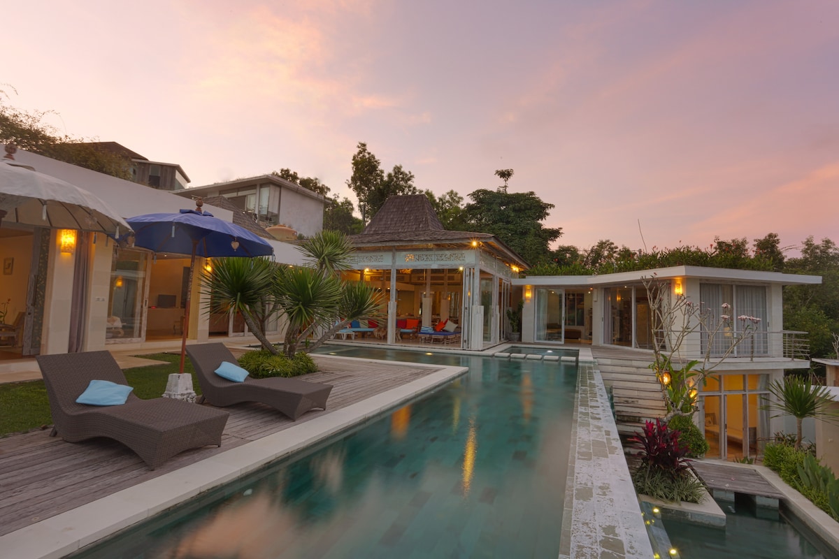 Luksuriøs, privat villa i tre etasjer, et ekte paradis på Sør-Bali. Det fantastiske L-formede svømmebassenget vårt er midtpunktet i det romslige salong-/spiseområdet, og det gir deg en unik og rolig atmosfære der du kan slappe av. Panoramautsikt fra taket, omgitt av en frodig grønn park, bare 20 minutter fra flyplassen og i nærheten av surfestrender. En bil og sjåfør er inkludert (gjester må betale for bensin og bompenger), slik at du enkelt kan utforske Bali.