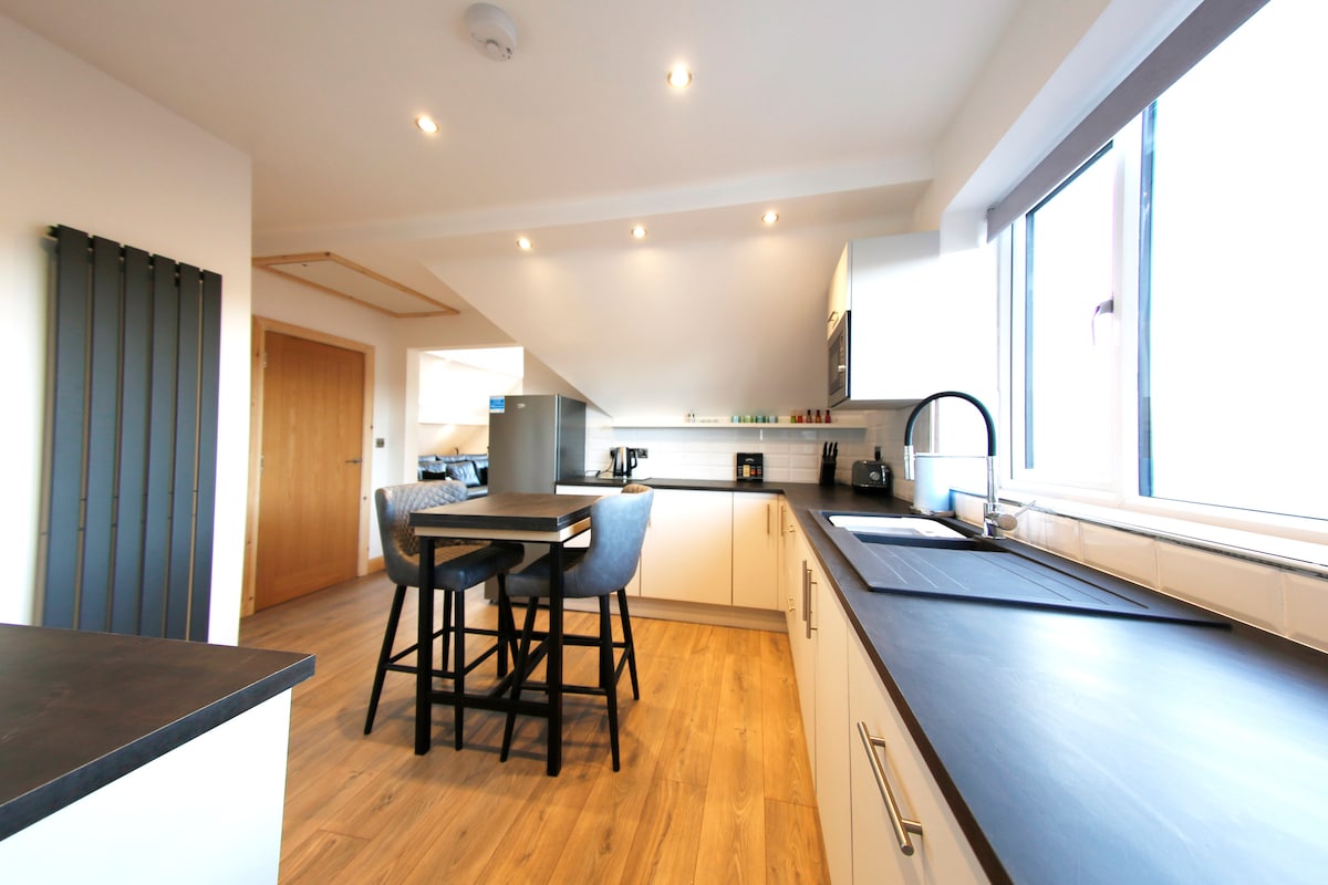 EKSKLUSIV LOFTSLEILIGHET MED HAVUTSIKT Skreddersydd toppleilighet, havutsikt, parkutsikt, balkong, vedbrann, 200tommers kino. Blackpools førsteklasses executive-leilighet i loftsstil. Nyt uavbrutt utsikt over havet og parken fra stuen / balkongen. Designerkjøkken og bad med walk-in spa-dusj. Full surroundlyd 200-tommers kinoopplevelse. Ekte tømmerbål og tregulv overalt for en unik loftsopplevelse. Ubegrenset 5GWifi, nøkkelfrie låser, sentralvarme og ladepunkt for elbiler.