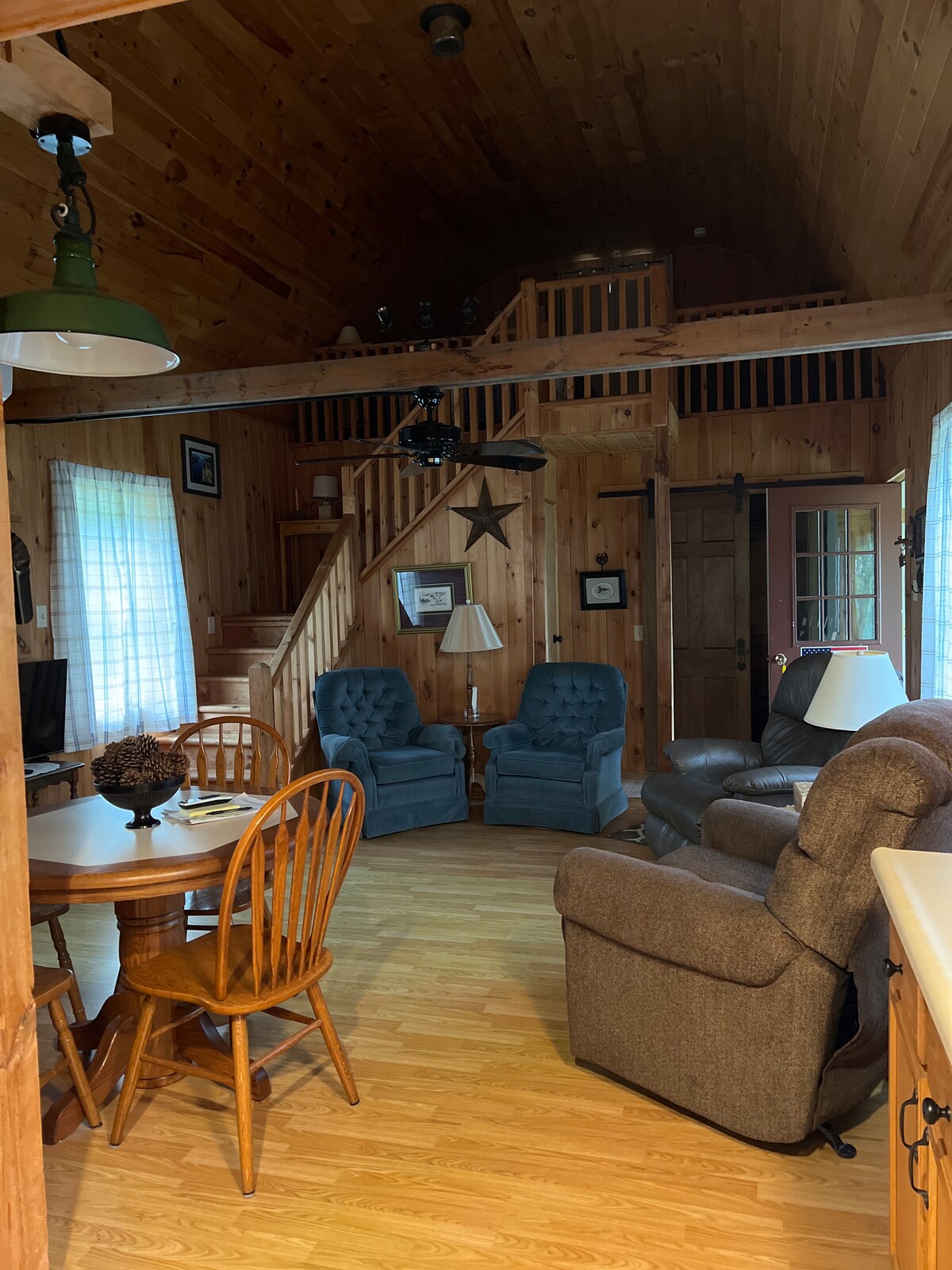 Slapp av sammen med hele familien på dette fredelige stedet ved enden av Black Lake. Hytte med utsikt over vannet med to rom og to loftsleiligheter på 50 hektar. 32'×20' uteplass med griller å lage mat på, mange utemøbler å slappe av på. Kjøkken og spisestue inne, og et bad med vaskemaskin og tørketrommel. Tilgang til elven, en brygge, fantastisk fiske fra bryggen eller fra kajakk, padlebrett, kano og robåt tilgjengelig. Stor hage for utendørs moro, stier å gå på, bålplass om kvelden, moro for alle!