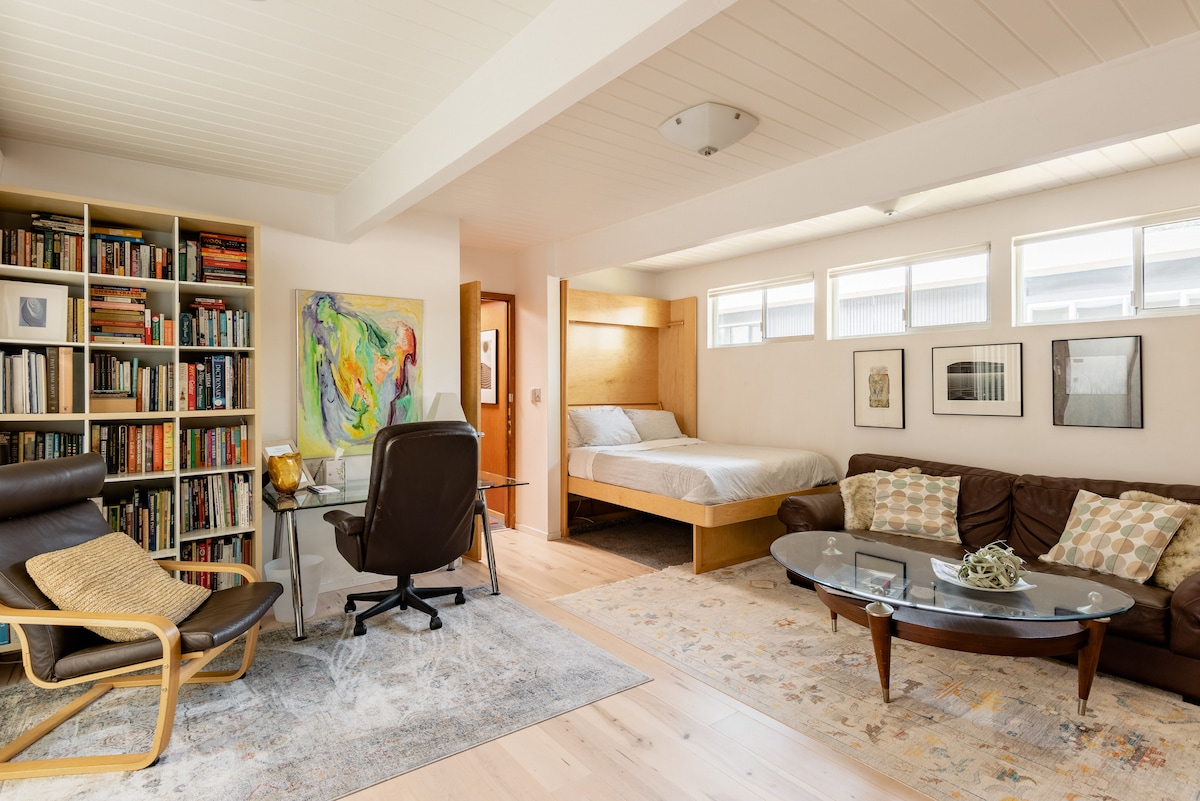 Velkommen til Savvy Studio~en ren og rolig leilighet hvor du kan slappe av eller jobbe i fred. Plassert i en egen fløy av et fint Eichler-hjem fra midten av århundret. Gå inn gjennom en privat, unik atriumbro til den låsbare inngangen til studioleiligheten din, som har en komfortabel seng i full størrelse, bord for arbeid eller spising, minikjøkken og privat bad.