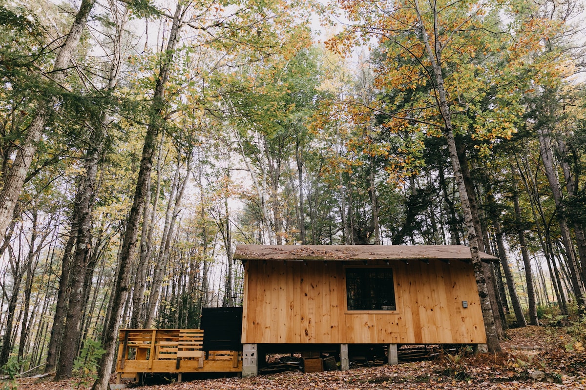 Ligger i skogen og ved Adams Pond med ny vedfyrt sauna! Hytta føles helt skjult, men det er mindre enn ti minutter unna Bridgton og Napoli, fotturer, strender og restauranter. Skogen er vakker og fredelig, og dammen ligger rett nede på en mosekledd sti. Perfekt for par eller en helg unna. Stort dekk med grill og utedusj, peis. Det er en felles brygge på dammen for bading, fiske eller bare for å nyte utsikten, samt en kano, to kajakker og et padlebrett.