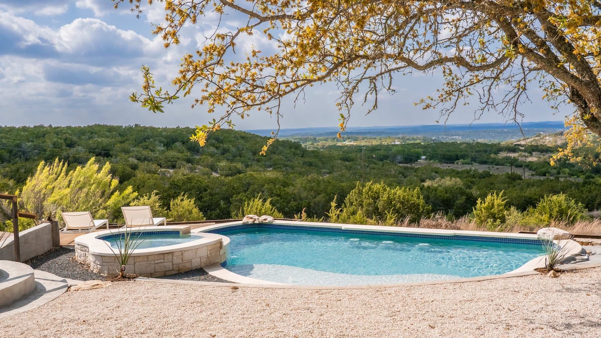 This 8-acre property offers a 3BR home, casita, fire pit, and children's playscape overlooking the stunning Texas Hill Country. A new pool, hot tub, + putting green will be available for bookings starting April/May 2026! Short commutes to popular Dripping Springs and Hill Country destinations! Best suited for multi-generational families, groups of friends, and corporate retreats.