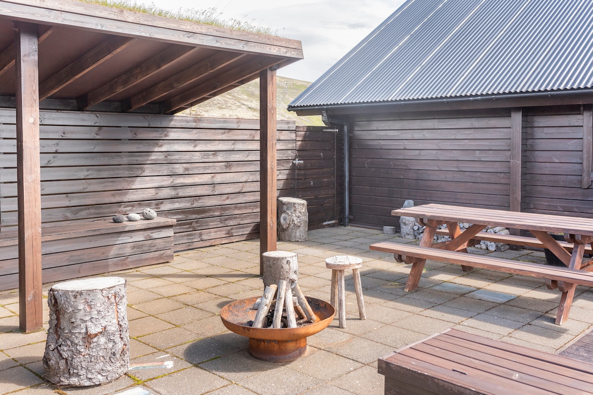 Denne leien er for to separate hus: Hvert hus har 2 rom og komplette bad med dusj, så 4 rom totalt for opptil 9 personer. Beliggenheten er på et stort privat land langt fra andre hus. Utenfor er det alltid et geotermisk boblebad og en badstue. Fullt utstyrt kjøkken og utegrill. Ligger på Golden Circle nær Geysir. Flott for utendørs fotturer til fantastiske steder og flott mørkt sted om vinteren for nordlysvisning. En firehjulsdrift er viktig for å få tilgang til huset om vinteren.