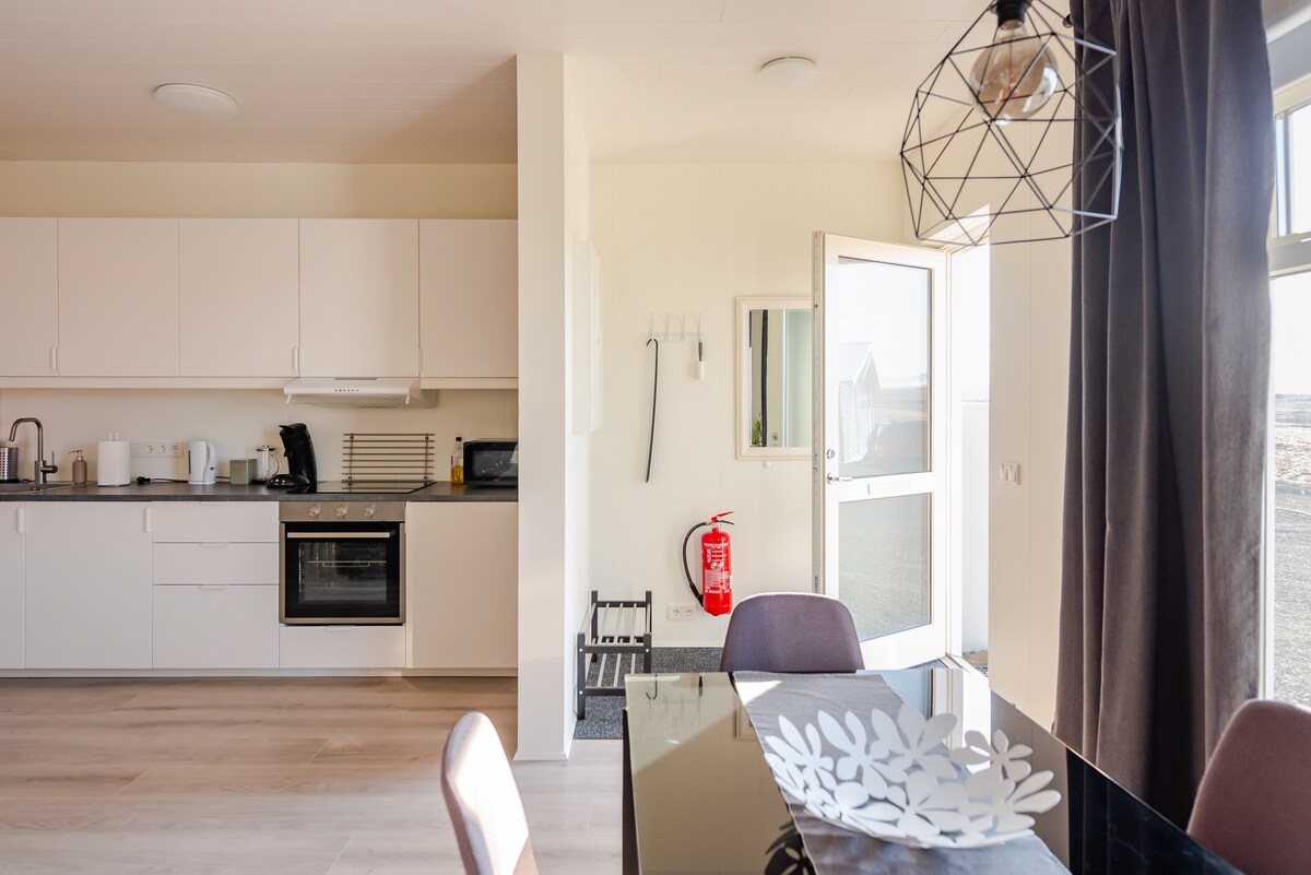 Denne ferien er svært unik og avsidesliggende. Den har spektakulær panoramautsikt over to av Islands mest berømte vulkaner og fantastiske nordlys. Huset er koselig med mange vinduer for å nyte utsikten. Soveplass til fire personer, en komfortabel seng i full størrelse og en luksuriøs sovesofa. Dette stedet har mye karakter og islandske kunstverk på veggene, og det har også kraftig trådløst nettverk og en smart-TV. Privat vaskerom med en vaskemaskin og en tørketrommel.