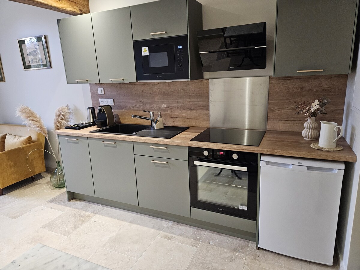 Slapp av i dette unike, rolige hjemmet, fullstendig renovert, nøye innredet hytte. Beliggende på en eiendom i hjertet av naturen med dam, kan du slappe av der. Regionen er full av historie. Plassert i en landsby med alle butikker. Hus med stue med kjøkkenkrok , sovesofa, 1 soverom 140 seng, bad. sengetøy inkludert mulighet for å fiske med hvitfisk velkommen!