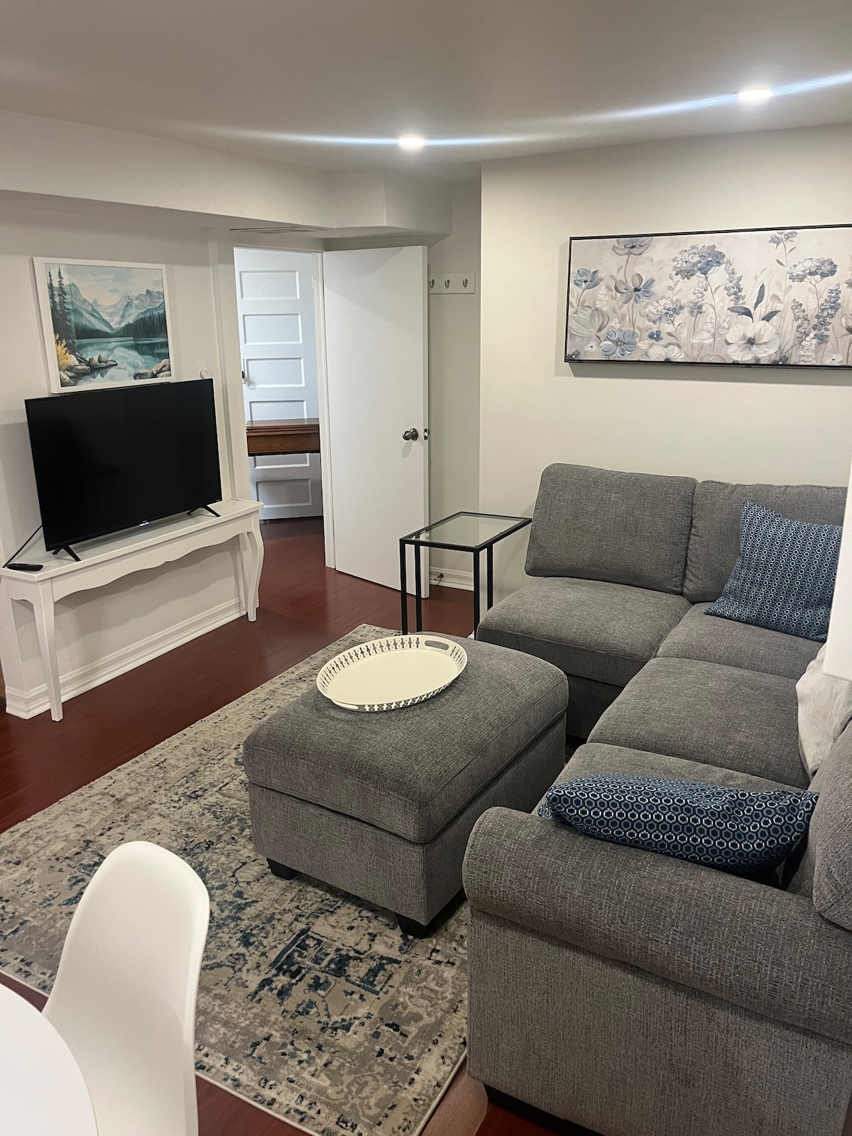 Rent åpent konsept, solfylt to soverom i hovedetasjen med PARKERING. Plass til opptil fire personer. Med enkel, moderne innredning, queensize-senger, store, vakre vinduer med gardiner som gjør det mørkt, oppbevaringsskap. Egne kontorpulter på soverommene. Fullt kjøkken, med olje, krydder, brødrister, vannkoker, Keurig-kaffemaskin og gratis kaffe og te. Rent bad med sjampo, balsam, dusjsåpe og fuktighetskrem. 60-tommers smart-TV, raskt trådløst nettverk. Innsjekking: kl. 15.00. Utsjekking: kl. 11.00.